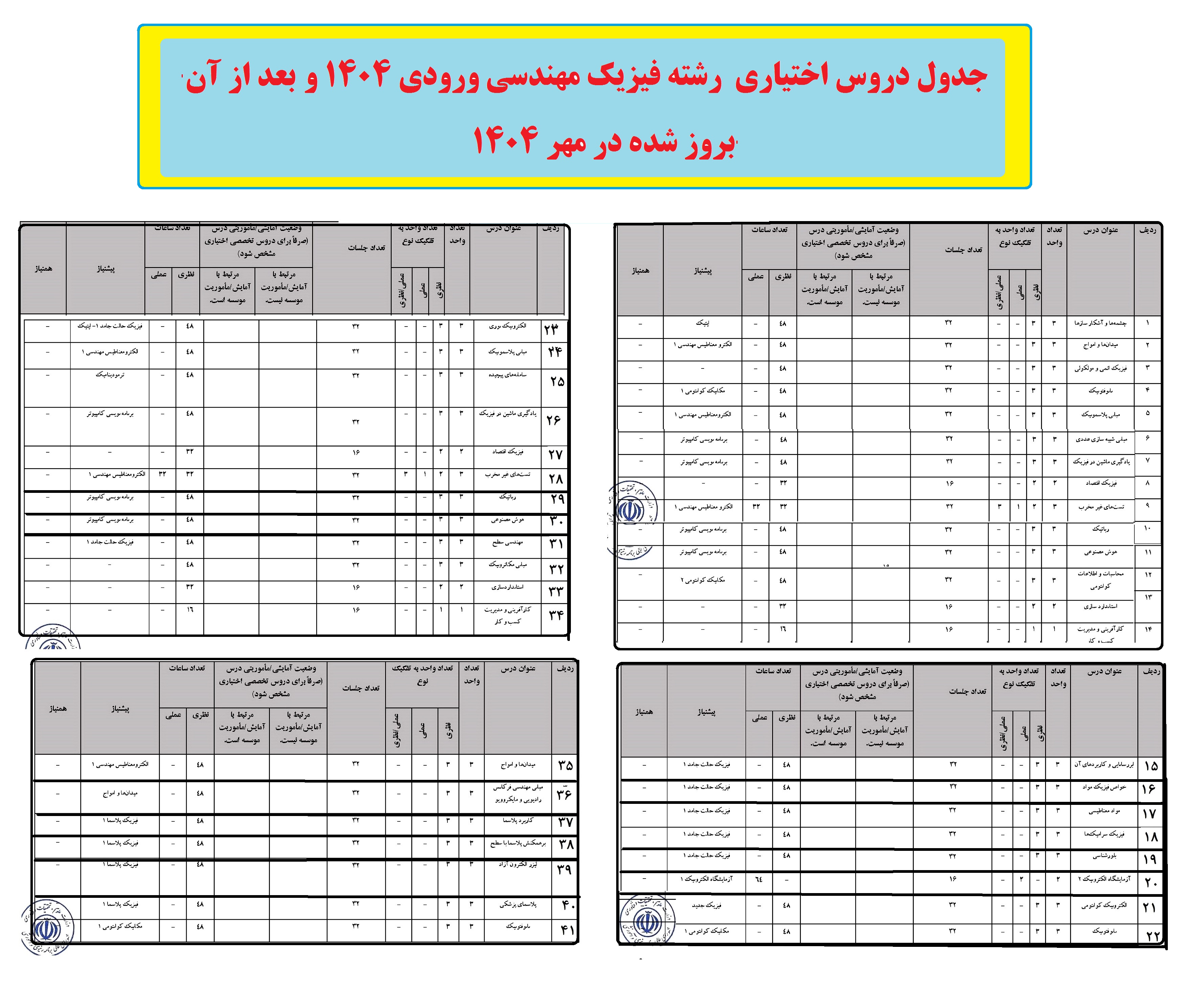 چیدمان انتخاب واحد پیشنهادی چهار ساله برای رشته ی فیزیک مهندسی ورودی ۱۴۰۴ و بعد از آن(تاریخ بروز رسانی این اطلاعیه- شهریور ۱۴۰۴) ۳۰ شهریور ۱۴۰۴ | ۱۰:۲۹ کد : ۲۶۱۹۴ اطلاعیه ها ارسال به دیگران نام شما ایمیل شما ایمیل دریافتکننده ارسال انصراف تعداد بازدید:۲۲۶