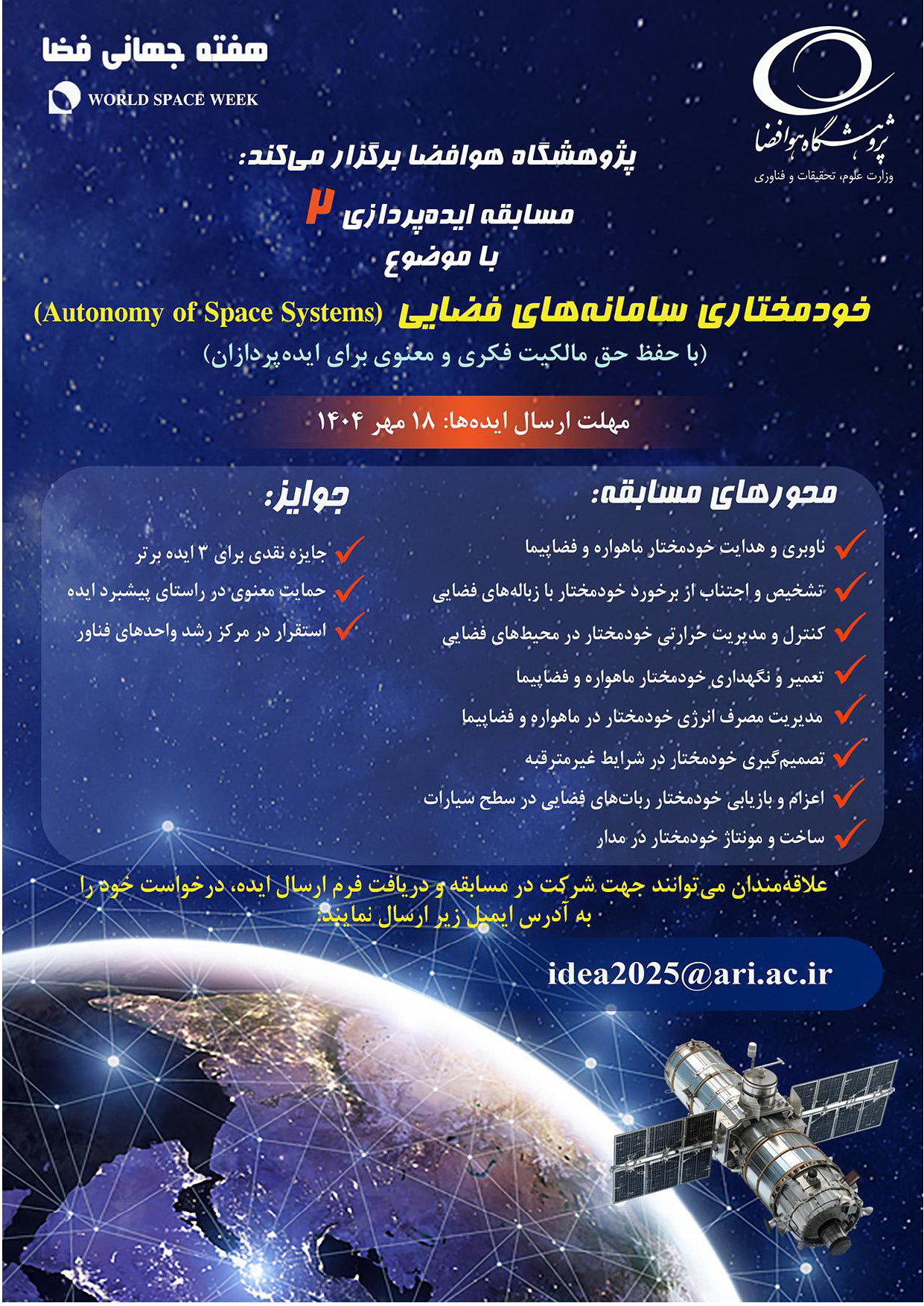 مسابقه ی ایده پردازی-خودمختاری سامانه های فضایی-پژوهشگاه هوا فضا مسابقه ی ایده پردازی-خودمختاری سامانه های فضایی-پژوهشگاه هوا فضا ۱۵ مهر ۱۴۰۴ | ۱۰:۲۲ کد : ۲۶۳۰۱ آخرین اخبار ارسال به دیگران نام شما ایمیل شما ایمیل دریافتکننده ارسال انصراف تعداد بازدید:۲۶