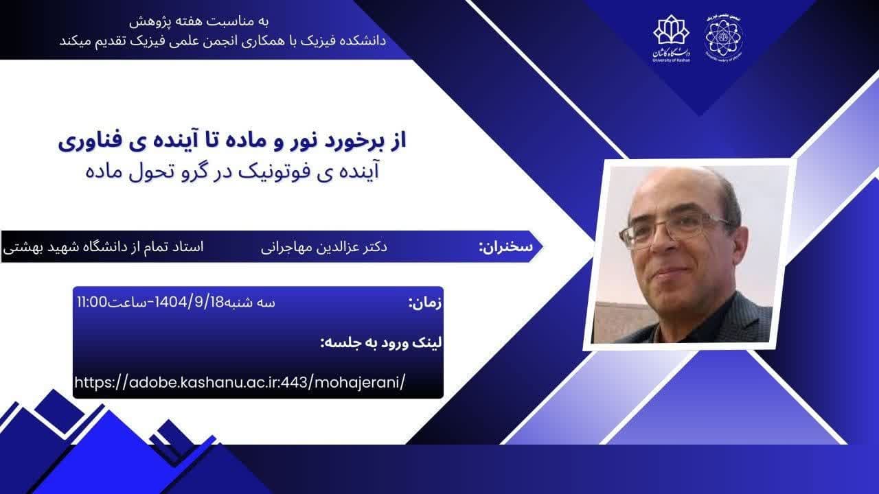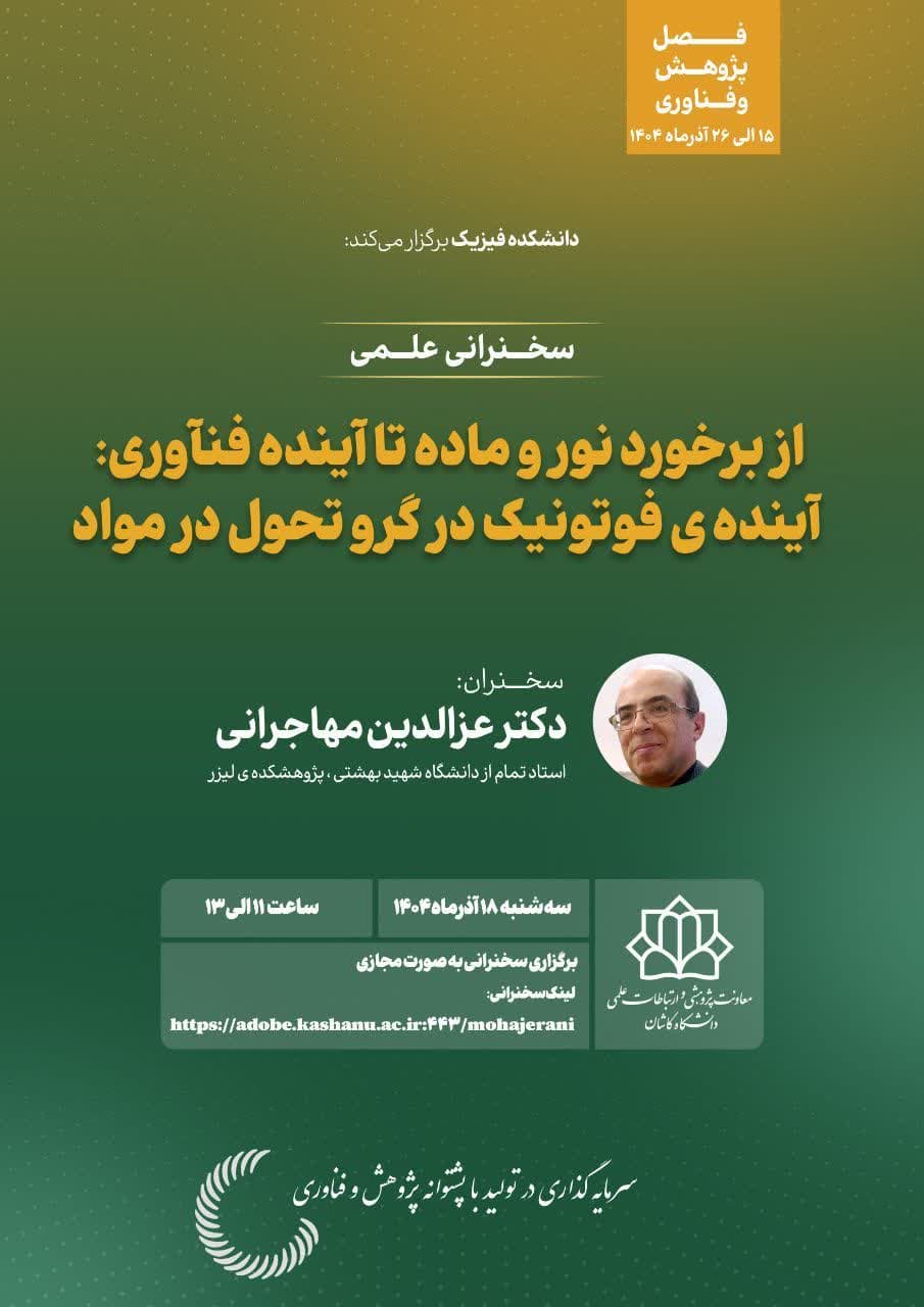در تاریخ سه شنبه 18 آذر 1404 با توجه به شرایط ویژه مرتبط با آلودگی هوا و شیوع آنفولانزای فصلی و غیر حضوری شدن دانشگاه کاشان ، با عنایت به هم آهنگی های از پیش انجام شده برای دعوت از استاد محترم ، جناب آقای پروفسور عزالدین مهاجرانی عضو هیات علمی پژوهشکده لیزر و پلاسمای دانشگاه شهید بهشتی جهت ایراد سخنرانی، مقرر گردید این مهم به صورت برخط توسط استاد محترم اجرا گردد. به همین جهت در اطلاعیه های انجام شده ، لینک جلسه نیز درج گردید و در موعد مقرر این سخنرانی تحت عنوان